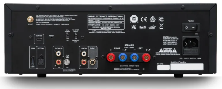 La face arrière est réellement dépouillée : 1 seule entrée Ligne, 1 entrée phono MM, 1 entrée numérique optique et 1 entrée HDMI eARC pour une connexion directe à la télévision. On peut aussi compter sur une sortie Subwoofer complétée par un interrupteur avec filtre passe-haut fixé à 80 Hz.