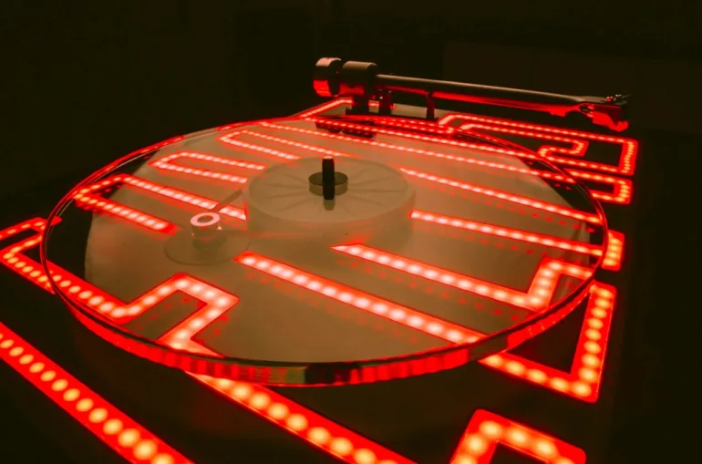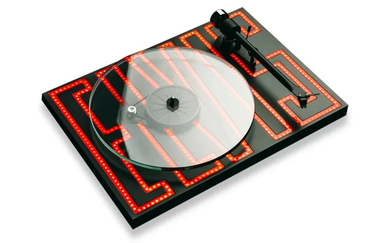 Le le plan technique, cette platine manuelle à entraînement par courroie s’inspire de la série T. Son socle destiné à capturer et immortalisé la présence scénique audacieuse et l’atmosphère électrique de l’une des performances les plus inoubliables de l’artiste est un « composé » de MDF usiné CNC agrémenté de plus multiples Led orange.