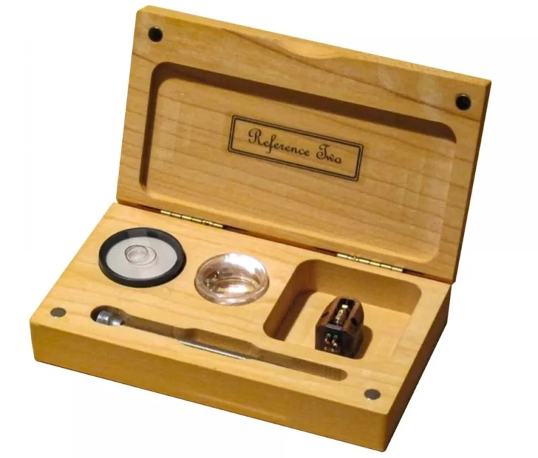 Sur la Reference Two, le concepteur a opté pour un corps en bois de bocote à haute densité (58 lb/cu ft). La bobine croisée spéciale en fer pur avec cuivre mono cristallin ultra-fin génère un signal stable. Le cantilever en rubis Ø 0,29 mm combine rigidité et faible masse pour des transitoires rapides. Le diamant nu super fine line contact trace fidèlement les rainures du vinyle. L’angle de suivi vertical de 20 degrés optimise le contact avec le disque.