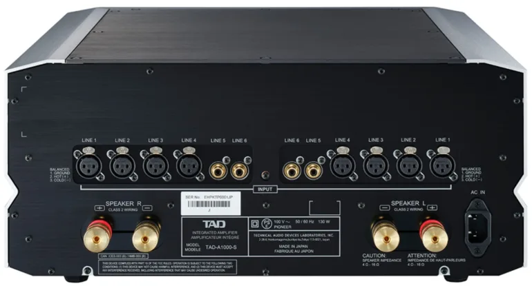 Le TAD-A1000 dispose exclusivement 6 entrées analogiques : 4 au standard XLR et 2 au standard RCA. 4 bornes sérieuses bornes HP sont destinées à relier les enceintes acoustiques en mode mono-câblage.