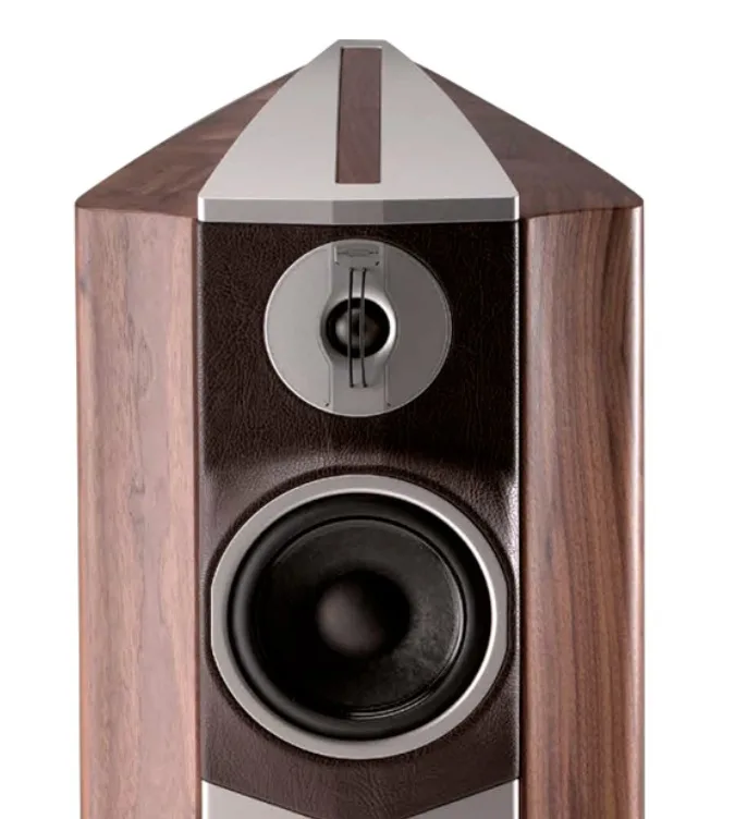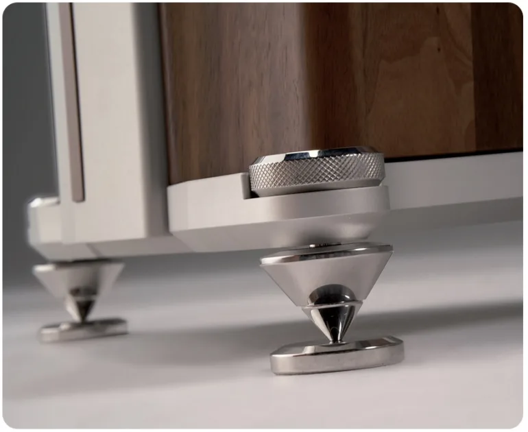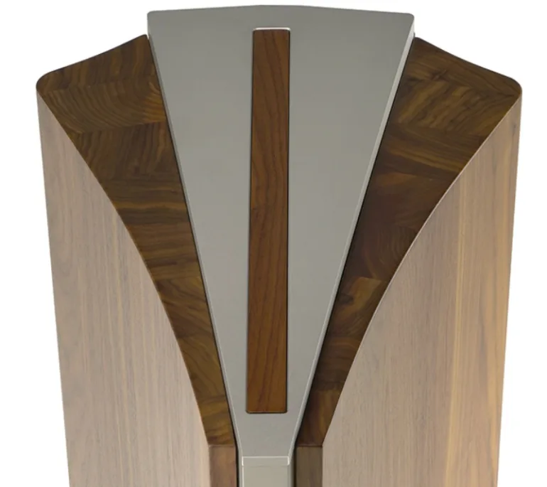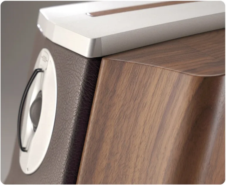 Cette construction s’adapte à la masse et aux propriétés mécaniques de la version en noyer massif. Le laquage comprend environ huit couches de revêtement, chacune finement polie à la main par des artisans qualifiés. Un usinage CNC de pointe donne aux ailes leur forme finale, fonctionnelle à bien des égards : elles sont sculptées à l’intérieur, offrant aux haut-parleurs un volume de charge exempt de réflexion et d’ondes stationnaires. Elles confèrent également à l’ensemble du coffret une construction à « mode d’amortissement à couches contraintes », pour une enceinte quasiment exempte de résonance. De plus, leur face avant est conçue pour charger l’émission du transducteur, optimisant ainsi sa dispersion sonore.
