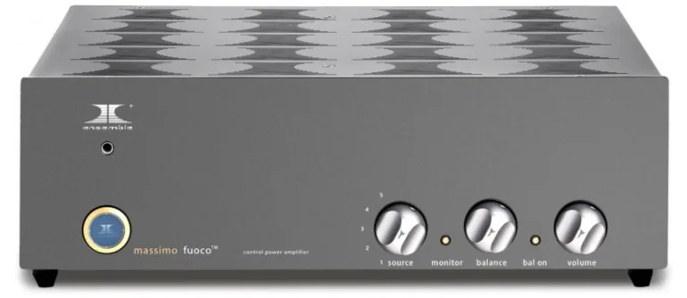 L’amplificateur intégré hybride Massimo Fueco reprend à son compte cette philosophie. D’allure relativement massive, cet « élément » se veut rassurant par sa présentation sobre et sa structure en aluminium épais. La face avant ne comporte qu’un sélecteur pour accueillir 5 sources analogiques contrôlées par relais , 1 réglage de balance et 1 réglage de volume motorisé.