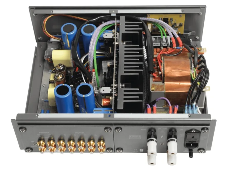 On notera par ailleurs, l’utilisation de composants spécifiques à la marque, tels que les connecteurs RCA Allino™, les connecteurs de sources et bornes de haut-parleur en cuivre argenté dorés pour une conductivité supérieure, ainsi que des condensateurs PROCAP™ et des câbles internes spécialement conçus pour répondre à des exigences strictes en matière de qualité sonore et de fiabilité.