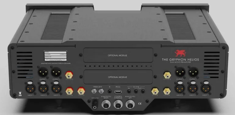 Helios est évolutif : deux emplacement sont prévus pour accueillir une carte phono MM et MC ainsi qu’une carte Dac également disponibles pour d’autres références GRYPHON.