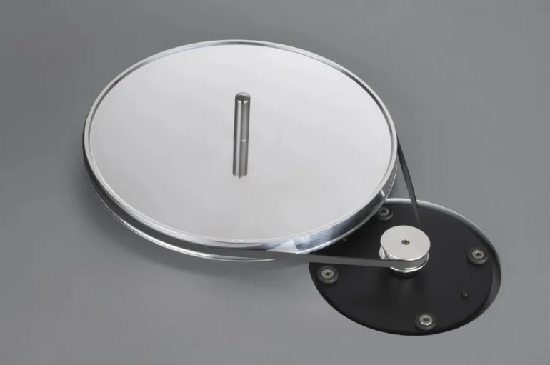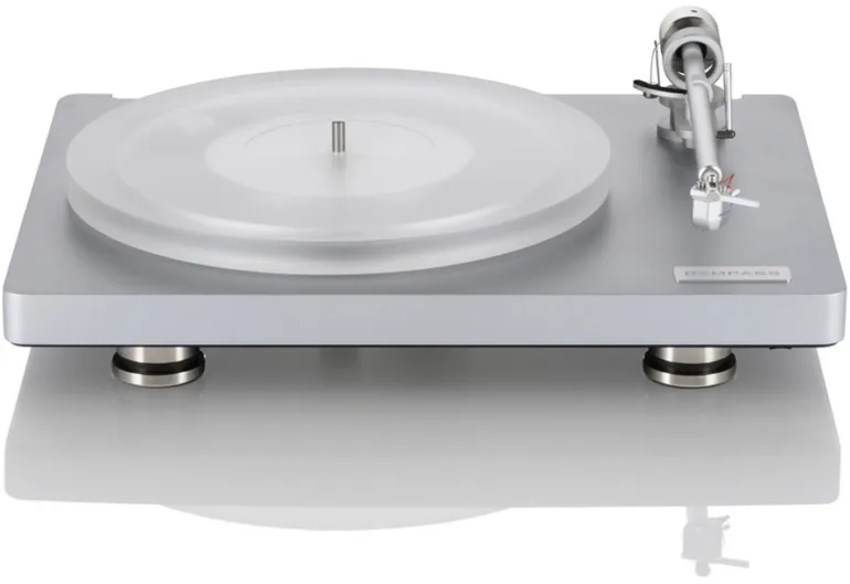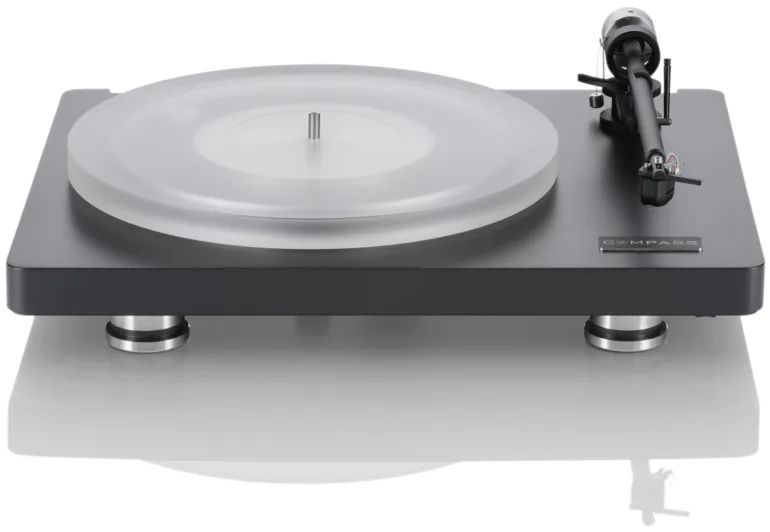 Compass est une platine entièrement manuelle à 2 vitesses 33,33 et 45 tr/m. L’entraînement du plateau s’effectue via un moteur DC 12V découplé, une courroie plate qui prend appuie sur un sous-plateau en aluminium dont l’axe est en acier poli. Il est inséré dans une gorge en bronze fritté qui se termine par un patin de butée en téflon. Le plateau en acrylique de 2 centimètres vient se poser sur le sous-plateau.