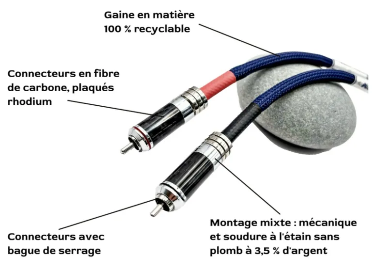 Tout en restant dans l’esprit initial, l’initiateur du projet s’est judicieusement rapproché de Paul Pellarin, gérant d’Hôte fidélité en Bretagne, spécialisé dans la commercialisation de matériel haut de gamme, pour développer une première gamme de quatre câbles : un câble secteur, un câble de modulation RCA, un câble HP et un accessoire astucieux qui va permettre de supporter le câble HP via le bornier d’une enceinte acoustique.