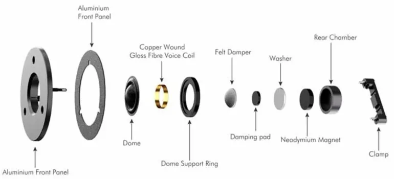 Le tweeter n’est pas tout à fait identique à celui de ses sœurs ainées. Il s’agit pour tant d’un modèle de 30 millimètres de diamètre à dôme textile enduit de 30 mm spécialement développé pour ce modèle. Il intègre une chambre arrière amortie pour absorber l’onde arrière du dôme. Cette innovation isole non seulement l’unité HF du reste du haut-parleur, mais elle présente également l’avantage de réduire la fréquence de résonance de l’unité des aigus.