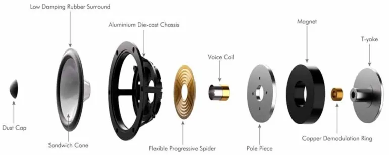 Le haut-parleur est soutenu par un système moteur à longue excursion doté d’un aimant à forte amplitude et d’une suspension à faibles pertes, garantissant un mouvement linéaire contrôlé même à des niveaux d’écoute élevés.