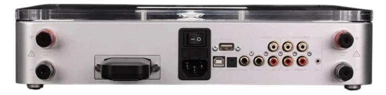 L’arrière du châssis finement usiné laisse apparaître 1 entrée analogique RCA, 1 entrée phono MM et 1 sortie Subwoofer. Côté numérique, nous aurons droit à 1 entrée numérique S/PDIF coaxiale, 1 entrée optique et 1 port USB asynchrone.