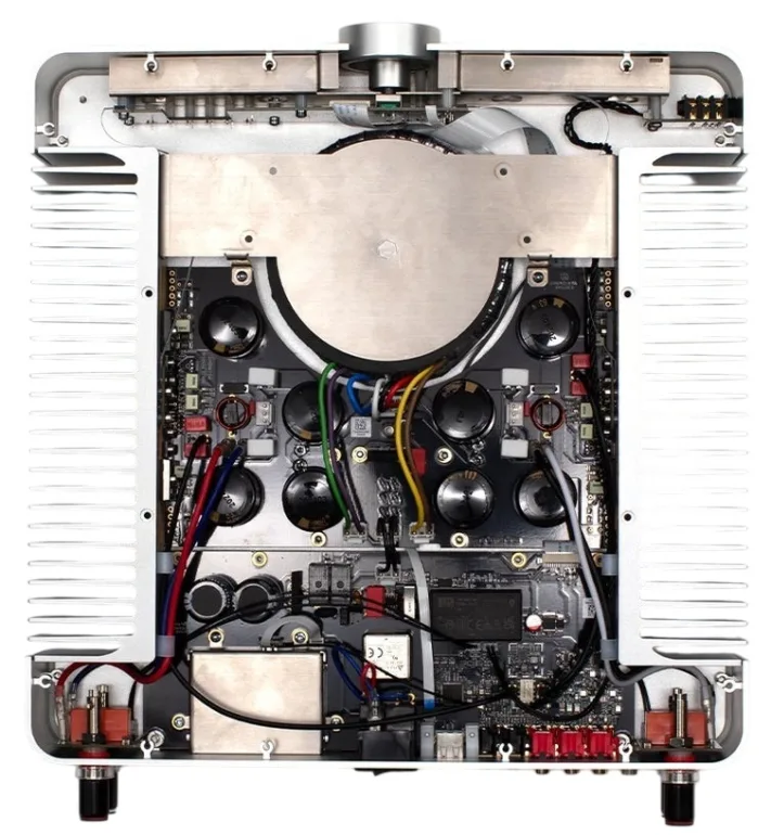 Sous le capot trône un schéma de type double mono reconnaissable par l’implantation des étages de sortie adossés aux grands radiateurs de dissipation thermique. Comme, par le passé, l’alimentation linéaire fait appel à un grand transformateur toroïdal dont la valeur n’est pas spécifiée. Il en est de même pour les condensateurs.