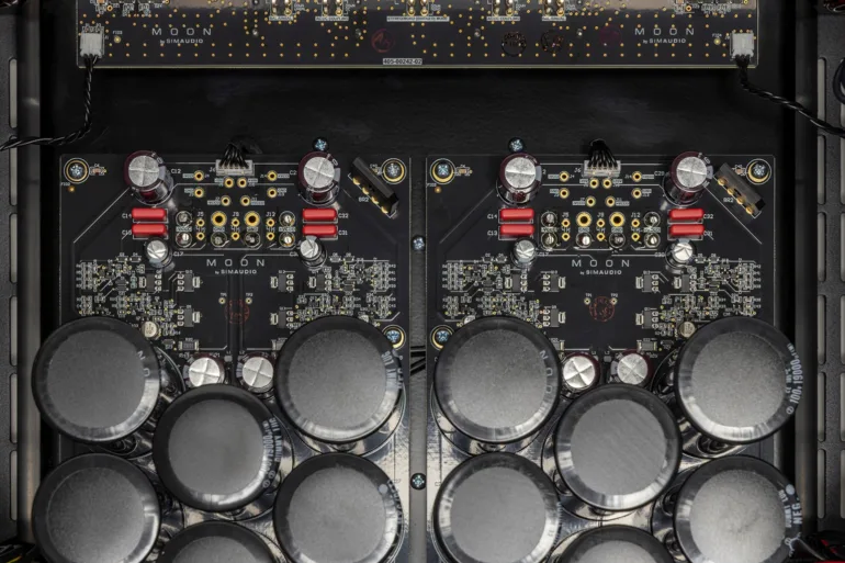 La carte phono MM & MC a, elle aussi, fait l’objet de toutes les attentions. Elle repose sur des amplis opérationnels très performants dans une implémentation optimisée dont MOON a le secret. Elle est assortie de condensateurs Wima de type polypropylène.