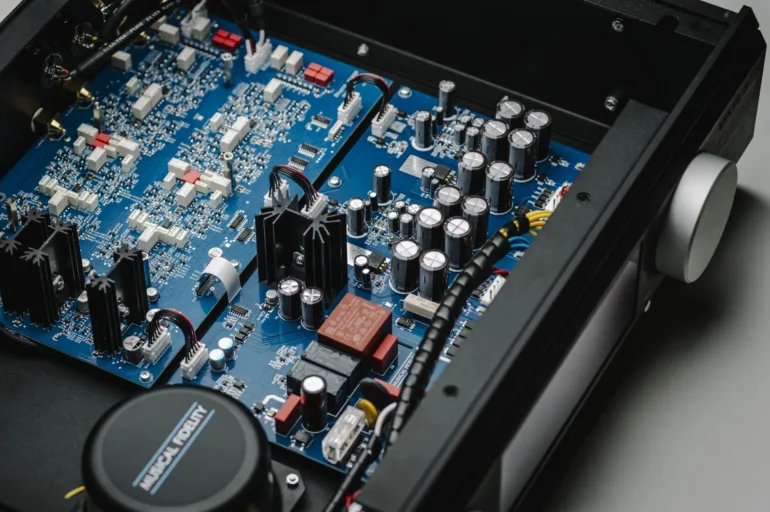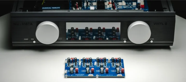 Outre la courbe RIAA standard, le constructeur a également implémenté les courbes DECCA et COLOMBIA, moins courantes. Les signaux audio provenant du préamplificateur phono sont acheminés vers une carte dédiée pour chaque canal comportant un étage Nuvistor discret de classe A entièrement symétrique. Celui-ci comporte 8 mini tubes Nuvistor 7586.