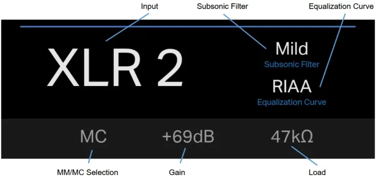 Compatible avec les courbes RIAA, DECCA et COLUMBIA, ce préamplificateur dispose d’un filtre subsonique dont la fréquence de coupure est fixée à 20 Hz avec 18 dB / octave. L’ensemble des fonctions de réglages est accessible via la télécommande livrée d’origine.