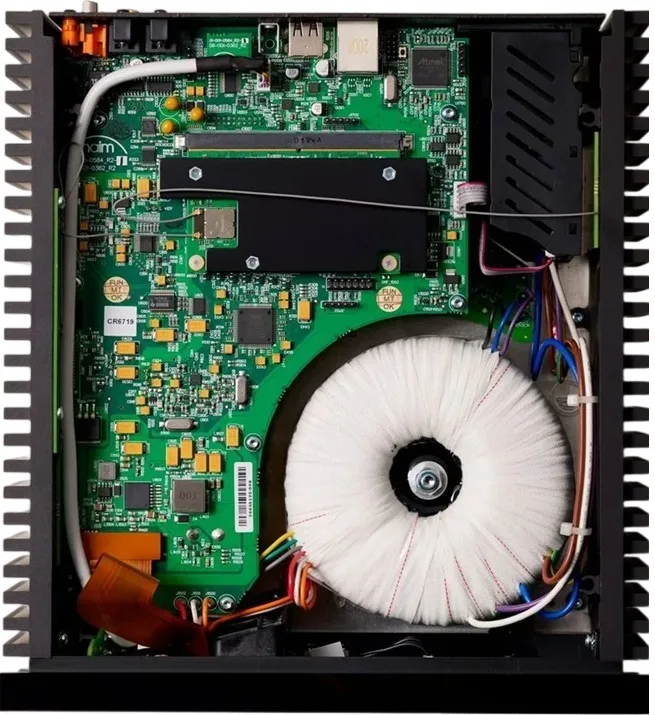 Au sein d’un châssis compact usiné dans l’aluminium, trône en bonne place l’alimentation. Le transformateur toroïdal, dont nous ne connaissons pas la valeur, prend une place prépondérante, comme sur la plupart des électroniques NAIM. Il est destiné, entre autres, à alimenter l’étage de sortie Ligne et casque polarisé en Classe AB. Le circuit principal muni de composants triés sur le volet adopte un schéma très court. A regret, NAIM ne donne pas davantage de détails techniques et s’abstient d’afficher un minimum de caractéristiques – mesquin !