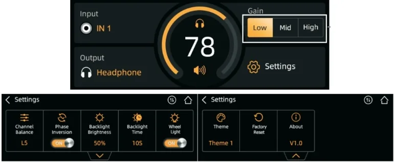 Certaines fonctions sont accessibles via l’écran tactile : « Paramètres » pour afficher d’autres paramètres système, notamment : l’équilibrage des canaux (balance), la luminosité du rétroéclairage, la durée du rétroéclairage, l’éclairage des icônes, le thème, et surtout l’inversion de phase – fonction jusqu’ici implantée sur les produits passés et présents très haut de gamme.