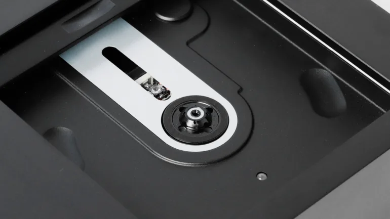 La trappe de fermeture en verre fumé foncé laisse apparaître un mécanisme d’origine Sanyo HD870, complété par la fameuse diode bleue (brevet YBA) qui représente le second signe distinctif.